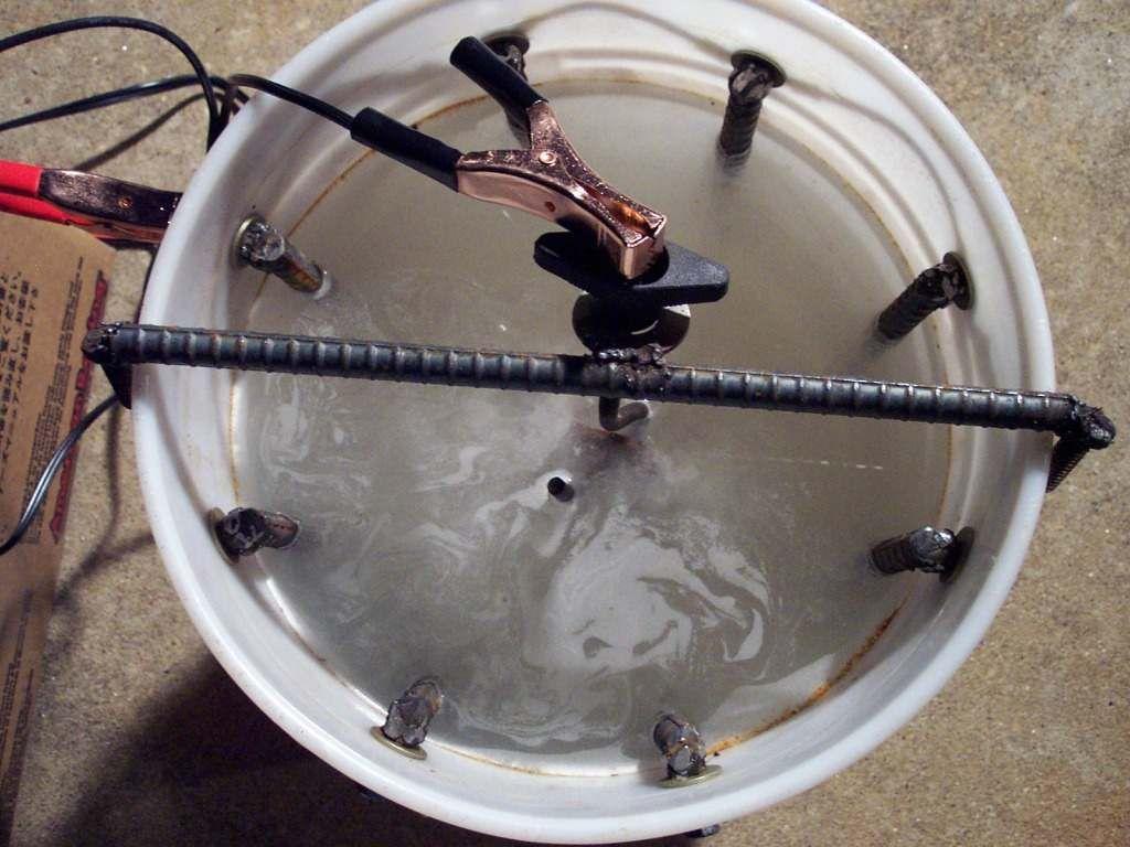 Метод неплохой, но занимает немало времени, требует подключение к электроэнергии, что потенциально опасно. Помимо этого не каждую деталь или поверхность можно погрузить в бочку с водой.
